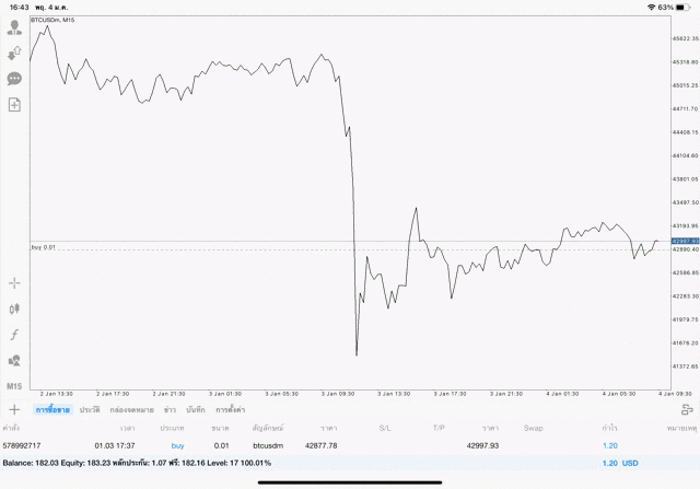เริ่มแล้ว การเทรด Crypto BTCUSD 0.01 lot บนแอพเล่นหุ้น mt4 เมื่อราคามีการเปลี่ยนแปลงจะส่งผลต่อกำไรหรือขาดทุนขึ้นกับการเทรดครั้งนี้ เริ่มต้น ติดลบก่อนนะ
