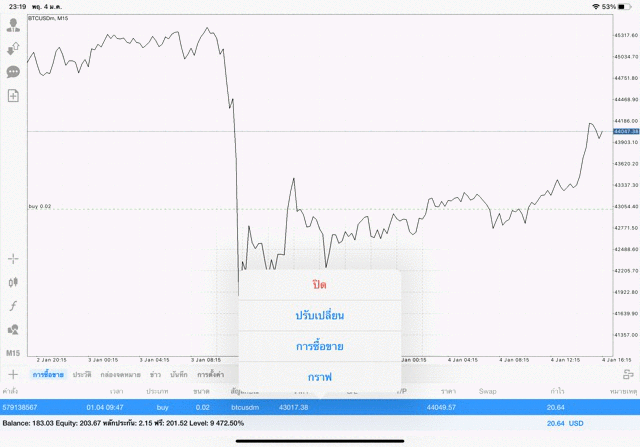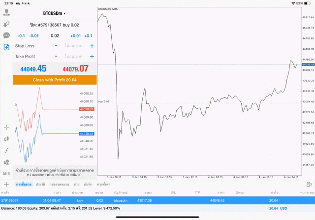 การเทรด Crypto BTCUSD 0.02 lot บนแอพเล่นหุ้น mt4 โบรกเกอร์ forex exness