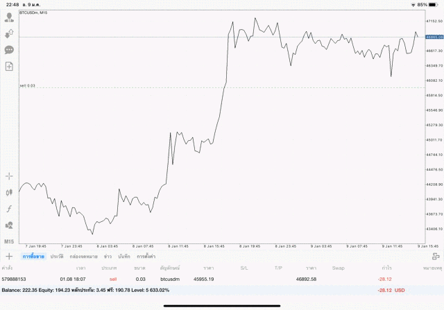 เริ่มแล้ว การเทรด Crypto BTCUSD 0.03 lot บนแอพเล่นหุ้น mt4 เมื่อราคามีการเปลี่ยนแปลงจะส่งผลต่อกำไรหรือขาดทุนขึ้นกับการเทรดครั้งนี้ เริ่มต้น ติดลบก่อนนะ