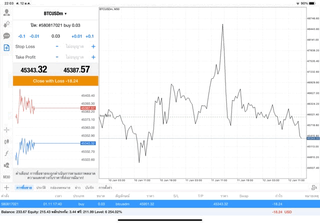 เริ่มแล้ว การเทรด Crypto BTCUSD 0.03 lot บนแอพเล่นหุ้น mt4 เมื่อราคามีการเปลี่ยนแปลงจะส่งผลต่อกำไรหรือขาดทุนขึ้นกับการเทรดครั้งนี้ เริ่มต้น ติดลบก่อนนะ