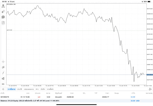 เริ่มแล้ว การเทรด Crypto BTCUSD 0.02 lot บนแอพเล่นหุ้น mt4 เมื่อราคามีการเปลี่ยนแปลงจะส่งผลต่อกำไรหรือขาดทุนขึ้นกับการเทรดครั้งนี้ เริ่มต้น ติดลบก่อนนะ