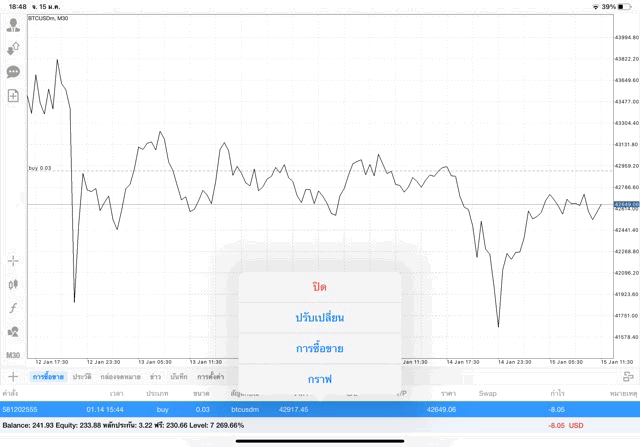 เริ่มแล้ว การเทรด Crypto BTCUSD 0.03 lot บนแอพเล่นหุ้น mt4 เมื่อราคามีการเปลี่ยนแปลงจะส่งผลต่อกำไรหรือขาดทุนขึ้นกับการเทรดครั้งนี้ เริ่มต้น ติดลบก่อนนะ