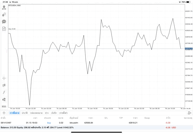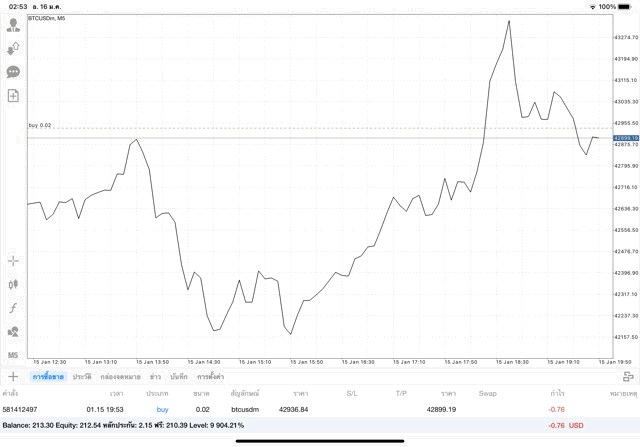 เริ่มแล้ว การเทรด Crypto BTCUSD 0.02 lot บนแอพเล่นหุ้น mt4 เมื่อราคามีการเปลี่ยนแปลงจะส่งผลต่อกำไรหรือขาดทุนขึ้นกับการเทรดครั้งนี้ เริ่มต้น ติดลบก่อนนะ