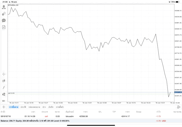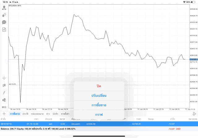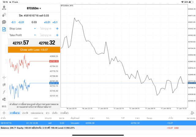 เริ่มแล้ว การเทรด Crypto BTCUSD 0.03 lot บนแอพเล่นหุ้น mt4 เมื่อราคามีการเปลี่ยนแปลงจะส่งผลต่อกำไรหรือขาดทุนขึ้นกับการเทรดครั้งนี้ เริ่มต้น ติดลบก่อนนะ